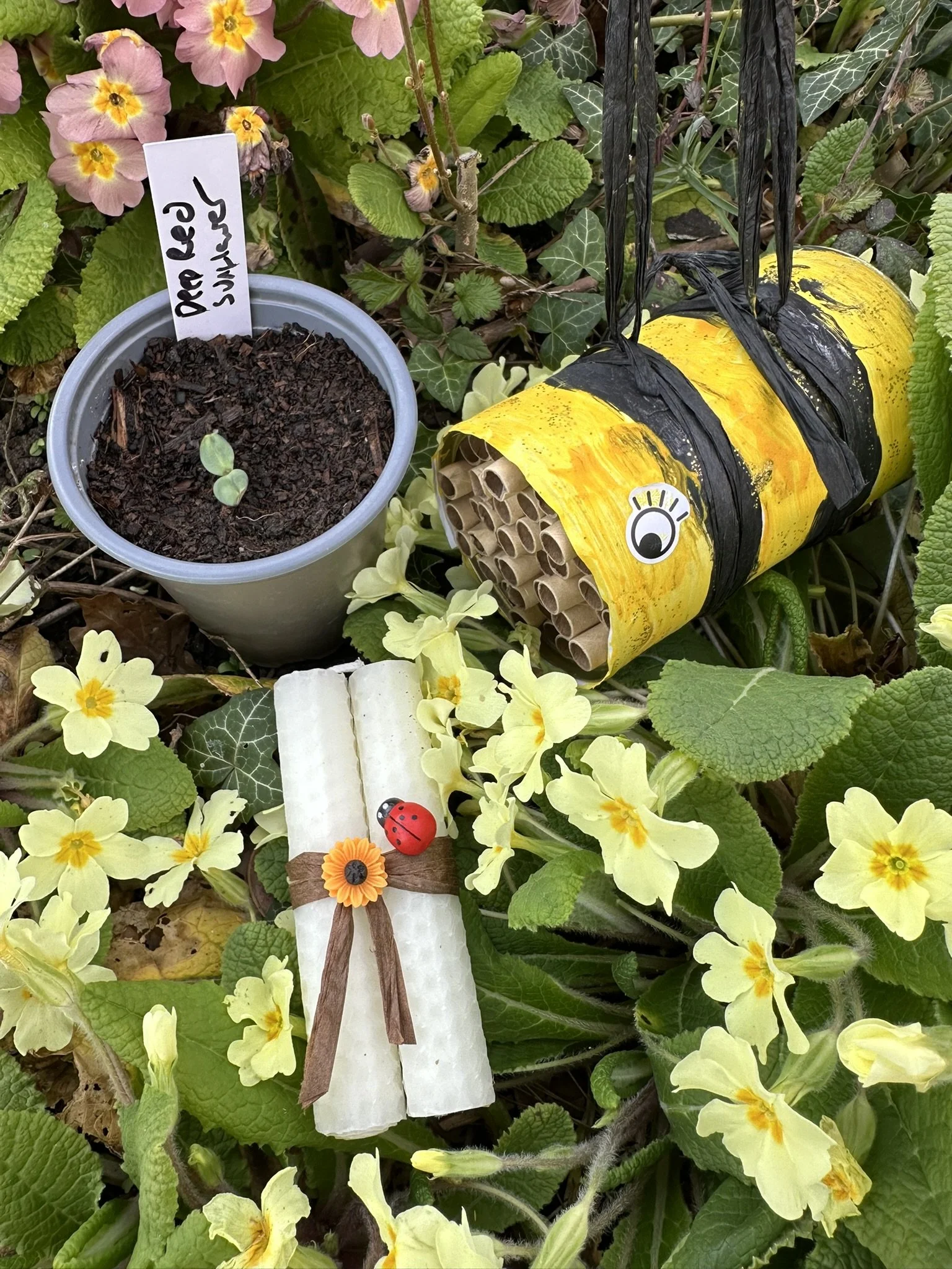 Then it’s time to get creative! We’ll talk about where bees live and how we can help them, before making mini bee hotels or planting flower seeds to take home.
